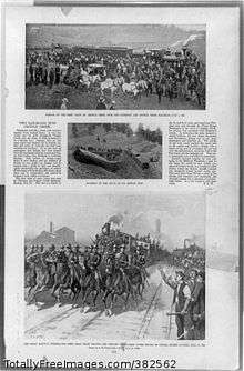 "Arrival of the first train at Cripple Creek over the Florence and Cripple Creek Railroad, July 1, 1894. Accident to the train on its return trip. The Great railway strikes--the first meat train leaving the Chicago [stoc]k-yards under escort of United States Cavalry, July 10, 1894"