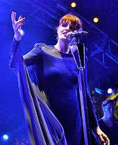 In an interview with New York Post's PopWrap, Welch revealed that in the weeks and months prior to her 12 September performance at the 2010 MTV Video Music Awards, she was so nervous she lost sleep and cried.[114] In addition, she struggled during the pre-show rehearsal with a move that required her to stand up on a rotating platform.[115] It was described as "both ethereal and downright joyous".[115] After the performance, Lungs rose to number two on the iTunes albums chart and "Dog Days Are Over" rose to number nine on the iTunes singles chart.[116] In addition, Florence and the Machine became the number-one search on Google and received 1,700 tweets per minute on Twitter.[116] Florence and the Machine performed "Dog Days Are Over" on The Ellen DeGeneres Show on 15 October 2010.[117] On 20 November 2010, the band performed "Dog Days Are Over" and "You've Got the Love" on Saturday Night Live.[118] They performed an online-only concert at New York City's Ed Sullivan Theater on 16 December 2010 as part of the Live on Letterman concert series.[119] Welch and a number of other female singers opened the 53rd Annual Grammy Awards on 13 February 2011 with a tribute to an ailing Aretha Franklin.[120] On 27 February 2011, Welch replaced pregnant Dido and sang her portion of Best Original Song nominee "If I Rise" (from 127 Hours) with A. R. Rahman at the 83rd Academy Awards.[121][122] Two years of worldwide touring had been scheduled to promote Ceremonials.[123] Welch and guitarist Rob Ackroyd held a private performance for a terminally ill 15-year-old fan, Karinya Chen, in Austin, Texas on 23 May 2016.[124]