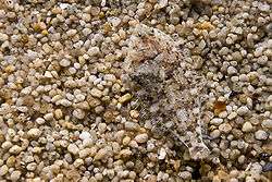In its life cycle, an adult flounder has two eyes situated on one side of its head, while at hatching one eye is located on each side of its brain. One eye migrates to the other side of the body as a process of metamorphosis as it grows from larval to juvenile stage. As an adult, a flounder changes its habits and camouflages itself by lying on the bottom of the ocean floor as protection against predators.[1] As a result, the eyes are then on the side which faces up. The side to which the eyes migrate is dependent on the species type.