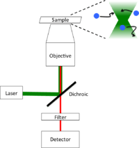 The typical FCS setup consists of a laser line (wavelengths ranging typically from 405–633 nm (cw), and from 690–1100 nm (pulsed)), which is reflected into a microscope objective by a dichroic mirror. The laser beam is focused in the sample, which contains fluorescent particles (molecules) in such high dilution, that only a few are within the focal spot (usually 1–100 molecules in one fL). When the particles cross the focal volume, they fluoresce. This light is collected by the same objective and, because it is red-shifted with respect to the excitation light it passes the dichroic mirror reaching a detector, typically a photomultiplier tube, an avalanche photodiode detector or a superconducting nanowire single-photon detector. The resulting electronic signal can be stored either directly as an intensity versus time trace to be analyzed at a later point, or computed to generate the autocorrelation directly (which requires special acquisition cards). The FCS curve by itself only represents a time-spectrum. Conclusions on physical phenomena have to be extracted from there with appropriate models. The parameters of interest are found after fitting the autocorrelation curve to modeled functional forms.[11]