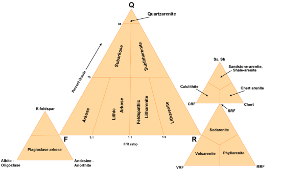As others before him, Folk proposed a classification for sandstones based on the relative abundances of quartz (Q), feldspars (F), and rock fragments (R). These are the main poles of the classification diagram.