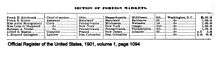 - Official Register of the United States Government. Washington: USGPO. issues of 1883, 1885, 1889, 1891, 1893, 1899, 1901, 1903, 1905, 1907, 1925-1959. Check date values in: