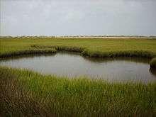 In the late 19th century, a long rock jetty called "The Rocks" was built west of Fort Fisher to aid navigation by stopping shoaling in the Cape Fear River.[2] Completed in 1881, The Rocks closed the former New Inlet, once used by Confederate blockade-runners to avoid the U.S. Navy, and created a lagoon, now called "The Basin". Today, The Rocks and The Basin are part of the Zeke's Island component of the North Carolina National Estuarine Research Reserve, an 1,160-acre (4.7 km2) area of outstanding estuarine and ocean resources with extensive marshes and tidal flats.