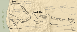 After being included in United States territory in 1846 upon settlement of the northern boundary with Canada, Fort Hall developed as an important station for emigrants through the 1850s on the Oregon Trail; it was located at the end of the common 500-mile stretch from the East shared by the three far west emigrant trails. Soon after Fort Hall, the Oregon and California trails diverged in northwesterly and southwesterly directions. An estimated 270,000 emigrants reached Fort Hall on their way west. The town of Fort Hall, Idaho later developed 11 miles to the east, and Pocatello developed about 30 miles south on the Snake River.