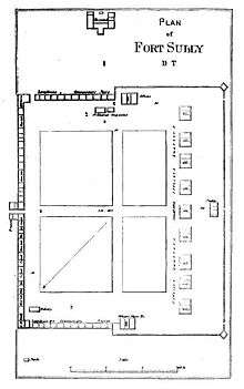 For officers' quarters there are nine detached frame buildings, built of pine, on brick foundations, with collars underneath. Each set has a back building of one story, as a kitchen. All the rooms are lathed and plastered. Three of the houses are one and a half stories high, and contain each four rooms, a hall, store-room, and pantry. Two cottages are of one story, while two others, of one and a half stories, are divided each into two sets of quarters of four rooms. None of these quarters have bath-rooms. The guard and prison-rooms are in the ends of the barrack building next the sally-port. The prisoners' room is 15 by 15 feet (4.6 m). The quartermaster's store-houses, two in number, measure 230 by 22 feet (6.7 m) and 120 by 24 feet (7.3 m). The commissary's store-houses, also two in number, measure 228 by 17 feet (5.2 m) and 50 by 22 feet (6.7 m).[9]
