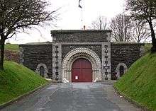 When the Seven Years' War brought conflict with France and Spain, it was decided to protect the dockyard from landward attack by means of a ditch and earthen rampart, known as the Dock Lines or later the Devonport Lines. The total length was about 2,000 yards (1,800 metres) and included four bastions and two gateways, a third gate was added at the end of the century to give access to the Torpoint Ferry. The lines were supported in the rear by a series of defensible barracks, each provided with a rampart and bastions.[10] A survey in 1805 shows 130 guns mounted on the lines and they were completely rebuilt from 1810 to 1816 with a stone faced rampart and a deeper ditch.[11] The lines were progressively abandoned and redeveloped in the second half of the 19th century.[10]