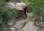 The headwaters of Fortymile and Willow Gulches have their origins along a 7 mile (11 km)[1] segment of the Straight Cliffs, the eastern edge of the Kaiparowits Plateau. Intermittent streams merge to form larger branches, then combine to carve a deep canyon up to 500 feet (150 m) into sandstone layers before meeting the main channel of the Escalante River. The northernmost branch is Fortymile Gulch, the historic location of the winter encampment of the San Juan Expedition. Intent on founding a colony in southeastern Utah, they waited at Fortymile Springs in late 1879 while a smaller group prepared a perilous route down to the Colorado River at Hole-in-the-Rock. Nearby is Dance Hall Rock, a scenic dome formed from Entrada sandstone.[2] The lower section of Fortymile Gulch, before it merges with Willow Gulch, is a narrow channel of slot canyons and water pools.