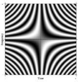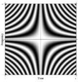 The Fourier operator defines a continuous two-dimensional function that extends along time and frequency axes, outwards to infinity in all four directions. This is analogous to the DFT matrix but, in this case, is continuous and infinite in extent. The value of the function at any point is such that it has the same magnitude everywhere. Along any fixed value of time, the value of the function varies as a complex exponential in frequency. Likewise along any fixed value of frequency the value of the function varies as a complex exponential in time. A portion of the infinite Fourier operator is shown in the illustration below, which depicts how it acts on a rectangular pulse to generate its Fourier transform (in this case, a sinc function):