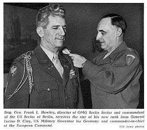 As commandant of the U.S. Sector of Berlin, Howley was finally promoted to Brigadier General in March, 1949. In this he was decorated personally by his superior, General Clay, U.S. Military Governor for Germany and commander-in-chief of the European Command.[17][18]