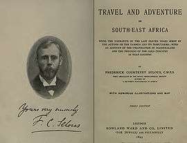 Frederick Courteney Selous DSO (/səˈl/; 31 December 1851 – 4 January 1917) was a British explorer, officer, hunter, and conservationist, famous for his exploits in Southeast Africa. His real-life adventures inspired Sir H. Rider Haggard to create the fictional Allan Quatermain character.[1][2] Selous was also a friend of Theodore Roosevelt, Cecil Rhodes and Frederick Russell Burnham. He was pre-eminent within a select group of big game hunters that included Abel Chapman and Arthur Henry Neumann. He was the older brother of ornithologist and writer Edmund Selous.