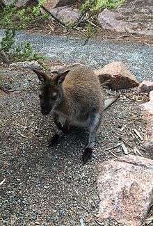 The red-necked wallaby, also called Bennett's wallaby (Macropus rufogriseus), is one of the most commonly seen animals within the park and can be spotted grazing on low lying vegetation such as grass, they are also known to gather around people.[10] Another common species seen is the eastern quoll (Dasyurus viverrinus), a marsupial carnivore which was previously sighted on the mainland of Australia but is now only found in Tasmania.[11] Also extinct on the mainland, the Tasmanian pademelon (Thylogale billardierii) is still common in Freycinet National Park but they are rarely seen during the day, coming out at night to feed.[12]