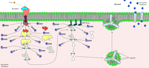 Insulin binds to the insulin receptor in its dimeric form and activates the receptor's tyrosine-kinase domain. The receptor then phosphorylates and subsequently recruits Insulin Receptor Substrate or IRS-1, which in turn binds the enzyme PI-3 kinase through the binding of the enzyme's SH2 domain to the pTyr of IRS. PI-3 kinase converts the membrane lipid PIP2 to PIP3. PIP3 is specifically recognized by the PH domains of PKB (protein kinase B) or AKT, and also for PDK1 which, being localized together with PKB, can phosphorylate and activate PKB. Once phosphorylated, PKB is in its active form and phosphorylates TBC1D4, which inhibits the GAP domain or the GTPase-activating domain associated with TBC1D4, allowing for Rab protein to change from its GDP to GTP bound state. Inhibition of the GTPase-activating domain leaves proteins next in the cascade in their active form and stimulates GLUT4 to be expressed on the plasma membrane. RAC1 is a GTPase which is also activated by insulin. Rac1 stimulates reorganization of the cortical Actin cytoskeleton [12] which allows for the GLUT4 vesicles to be inserted into the plasma membrane.[13][14] RAC1 Knockout mouse have reduced glucose uptake in muscle.[14]