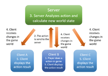 A Game client is a network client that connects an individual user to the main game server, used mainly in multiplayer video games. It collects data such as score, player status, position and movement from a single player and send it to the game server, which allows the server to collect each individual's data and show every player in game[1], whether it is a arena game on a smaller scale or a massive game with thousands of players on the same map. Even though the game server displays each player's information for every player in a game, players still have their own unique perspective from the information collected by the game client, so that every player's perspective of the game is different, even though the world for every player is the same. The game client also allows the information sharing among users. An example would be item exchange in many MMORPG games where a player exchange an item he/she doesn't want for an item he/she wants, the game clients interconnect with each other and allows the sharing of information, in this exchanging items. Since many games requires a centralized space for players to gather and a way for users to exchange their information, many game clients are a hybrid of client-server and peer-to-peer application structures.