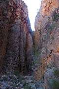 Some of the most interesting features of the ranges are these deep gorges cut in the south-eastern side of the Blue Range: Bunyip Chasm, The Terraces, and Fern Chasm are all areas often visited by bushwalkers. Although lower than the mountains which surround it on three sides, the dramatic Cleft Peak is also often visited, so-named for a spectacular cleft separating it into two summits, and providing opportunities for rockclimbing to a summit, not often necessary with peaks in the Flinders.