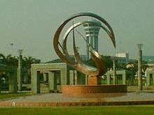 An emblem of the airport. Behind, the control tower can be clearly seen