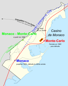 The railway line from Marseille reached Monaco in 1868. The station, originally named Monaco (Gare de Monaco), was renamed Monaco-Monte Carlo in the 1950s, after the building of a new tunnel bypassing a second SNCF station named Monte Carlo.[1][2][3]