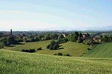 Typical view of the hilly countryside of Gascony, with the Pyrenees mountains in the far distance