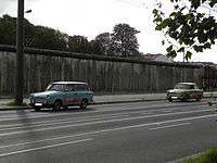 The memorial includes a 60-metre (200 ft) long section of the wall as it was when the Wall fell.[6] Seen from the west, a wall built from L-elements was lined by a sandy section, a lighted "Kolonnenweg", a signal fence, and an inner wall. Finally a tower was built within the complex. The area is not accessible to visitors;[7] both ends of the original wall are closed by stainless steel.[6] The northern wall bears the inscription "In Erinnerung an die Teilung der Stadt vom 13. August 1961 bis zum 9. November 1989 und zum Gedenken an die Opfer kommunistischer Gewaltherrschaft" (In memory of the city's division from 13 August 1961 to 9 November 1989 and of the victims of communist tyranny").[8]