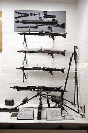 A general-purpose machine gun (GPMG) is an air-cooled, belt-fed weapon with a quick change barrel that can be used in a variety of roles, from bipod- or tripod-mounted infantry support, to deployment as a helicopter door gun, or a vehicle-mounted support weapon.[1] Modern GPMGs fire full-power rifle cartridges such as the 7.5×54mm French, 7.5×55mm Swiss, 7.62×51mm NATO, 7.62×54mmR, 7.92×57mm Mauser, etc.