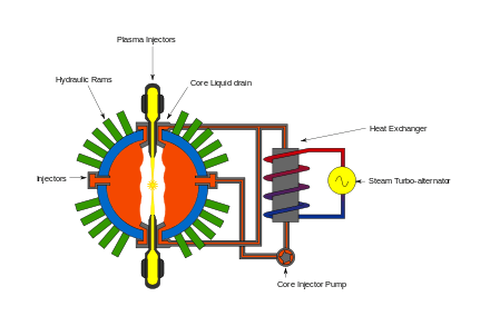 At maximum compression the conditions for fusion are briefly met and a fusion burst occurs releasing its energy in fast neutrons. The neutrons are slowed down by the liquid metal causing it to heat up. A heat exchanger transfers that heat to a standard steam cycle turbo-alternator to produce electricity.[15]