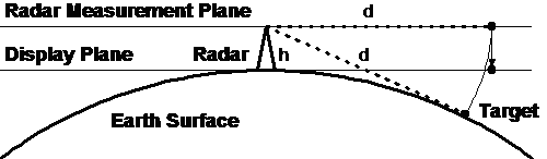 The radar sensor is positioned on the earth surface with a height h above the ground. It measures the direct distance d to the target (and not e.g. the distance the target is away from the radar if one would move on the earth surface). This distance is then used in the display plane after adjustment to the current display zoom level by the radar scan converter (RSC). Now it has to be clarified how the radar video data is geo referenced. This basically means, that if we want to display a geographical real world object (like e.g. a light house) which is at the same real world position as the radar target, that it also shall appear at the same position in the display plane. This is realized by calculating the distance from the radar sensor to the respective real world object and use that distance in the display plane. The position of the real world object is typically given in geographical coordinates (latitude, longitude and height above the earth surface). In other words, using a radar projection with geographical data is done by simulating a radar measurement process with the real world objects and use the resulting range and azimuth in the display plane.