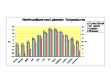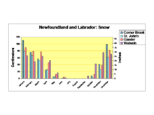 Monthly average temperatures, rainfall and snowfall for four communities are shown in the attached graphs. St. John's represents the east coast, Gander the interior of the island, Corner Brook the west coast of the island and Wabush the interior of Labrador. The detailed information and information for 73 communities in the province is available from a government website.[33] The data used in making the graphs is the average taken over thirty years. Error bars on the temperature graph indicate the range of daytime highs and night time lows. Snowfall is the total amount which fell during the month, not the amount accumulated on the ground. This distinction is particularly important for St. John's where a heavy snowfall can be followed by rain so that no snow remains on the ground.