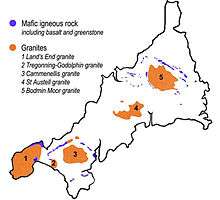 The intrusion of the granite into the surrounding sedimentary rocks[3] gave rise to extensive metamorphism and mineralisation,[4] and this led to Cornwall being one of the most important mining areas in Europe until the early 20th century. It is thought that tin ore (cassiterite) was exploited in Cornwall as early as the Bronze Age. Over the years, many other metals such as copper, lead, zinc and silver have all been mined in Cornwall.[5] Alteration of the granite also gave rise to extensive deposits of china clay (kaolinite), especially in the area to the north of St Austell, and this remains one of Cornwall's most important industries.
