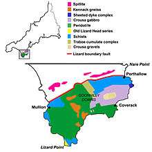 The Lizard complex is Britain's most complete [6] example of an ophiolite. Much of the peninsula consists of the dark green and red rock, serpentinite, which forms cliffs as at Kynance Cove, and can be carved and polished to create ornaments. This ultramafic rock forms a very infertile soil which covers the flat and marshy heaths of the Goonhilly Downs.