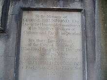 Drummond is buried in the Canongate Churchyard the burial ground of the Canongate Kirk. His name is remembered locally in Drummond Place, the street in the New Town which was developed in the location where he had owned a country house in what is now Drummond Place Gardens[4] and Drummond Street, next to the site previously occupied by the Royal Infirmary.