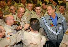 In 2004, Bush commanded broad support in the Republican Party and did not encounter a primary challenge. He appointed Ken Mehlman as campaign manager, with a political strategy devised by Karl Rove.[91] Bush and the Republican platform included a strong commitment to the wars in Iraq and Afghanistan,[92] support for the USA PATRIOT Act,[93] a renewed shift in policy for constitutional amendments banning abortion and same-sex marriage,[92][94] reforming Social Security to create private investment accounts,[92] creation of an ownership society,[92] and opposing mandatory carbon emissions controls.[95] Bush also called for the implementation of a guest worker program for immigrants,[92] which was criticized by conservatives.[96]