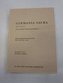 The aim of the Germania Sacra is to deliver a historical and statistical description of the church institutions of the Holy Roman Empire. To that end it aims to capture and display all sources and literature of ecclesial institutions from the bishoprics (with a focus on the episcopal series or Bischofsreihen) to the cathedral chapters and monasteries for the medieval and early modern periods until their demise in Reformation or under secularisation.