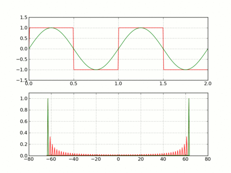 Animation of the additive synthesis of a square wave with an increasing number of harmonics. The Gibbs phenomenon is visible especially when the number of harmonics is large.