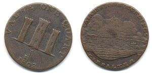 Traders' currency tokens were issued in Gibraltar between 1802 and 1820 by Robert Keeling, Richard Cattons, and James Spittles. There were two denominations - 1 quart (or quarto) and 2 quarts (or 2 quartos).