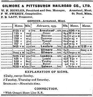 The Gilmore and Pittsburgh Railroad (G&P), now defunct, was an American railroad located in southwestern Montana and east-central Idaho. Constructed in 1909 and 1910 between the towns of Armstead, Montana, and Salmon, Idaho, the G&P served mining and agricultural areas in Lemhi County, Idaho, and Beaverhead County, Montana. The line was financially backed by the Northern Pacific Railway, and later became its subsidiary. Never financially successful, the G&P ceased operations in 1939, and the railroad was dismantled the following year.