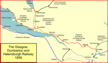 The Glasgow, Dumbarton and Helensburgh Railway was independently sponsored to build along the north of the River Clyde. It opened in 1858, joining with an earlier local line serving Balloch. Both were taken over by the powerful North British Railway in 1865, and for some time the line was the main route in the area. As industry developed other lines were opened to serve it, and the line formed the core of a network in the area.