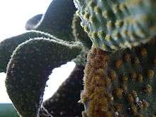 Glochids or glochidia (singular "glochidium") are hair-like spines or short prickles, generally barbed, found on the areoles of cacti in the sub-family Opuntioideae. Cactus glochids easily detach from the plant and lodge in the skin, causing irritation upon contact. The tufts of glochids in the areoles nearly cover the stem surfaces of some cactus species, each tuft containing hundreds of glochids; this may be in addition to, or instead of, the larger, more conspicuous cactus spines, which do not readily detach and are not generally barbed.