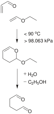 Glutaraldehyde is produced industrially by the oxidation of cyclopentene and by the Diels-Alder reaction of acrolein and methyl vinyl ether followed by hydrolysis.[3]