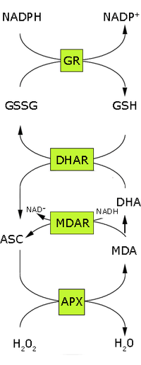 In the first step of this pathway, H2O2 is reduced to water by ascorbate peroxidase (APX) using ascorbate as the electron donor. The oxidized ascorbate (monodehydroascorbate) is regenerated by monodehydroascorbate reductase (MDAR).[2] However, monodehydroascorbate is a radical and if not rapidly reduced it disproportionates into ascorbate and dehydroascorbate. Dehydroascorbate is reduced to ascorbate by dehydroascorbate reductase at the expense of GSH, yielding oxidized glutathione (GSSG). Finally GSSG is reduced by glutathione reductase (GR) using NADPH as electron donor. Thus ascorbate and glutathione are not consumed; the net electron flow is from NADPH to H2O2. The reduction of dehydroascorbate may be non-enzymatic or catalysed by proteins with dehydroascorbate reductase (DHAR) activity, such as glutathione S-transferase omega 1 or glutaredoxins.[3][4]