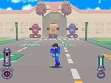 Although the only way to move in the game is on foot, once Roll Caskett repairs a support car, she is able to directly take Mega Man to specific areas.[4] In Legends, large gems called Refractors are used as a power source. Small shards of them can be exchanged for money, and in the game, enemies that are destroyed will often drop these Refractor Shards. When shards are picked up, the equivalent amount of Zenny, the game's basic unit of currency, is added automatically. The health of Mega Man can be increased through the game in the shops, while it can be recovered through packs bought at shops, obtaining red spheres from defeated opponents or by asking the character Data to recover Mega Man's health.[5] Mega Man also has a Life Shield which reduces the damage that he can receive from enemies.[3] The damage caused by enemies can also be reduced by obtaining upgrades to Mega Man's armor or his helmet. Mega Man's interactions with characters from the game can also affect the price of objects.[6][7] If the player makes Mega Man be rude with characters, prices from objects will be increased and the dialogues with people will also change.