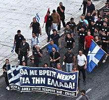 Golden Dawn demonstration in 2012, with some of the demonstrators carrying a sign reading "You will find me dead for Greece! – Honor and glory to our dead – 'Stochos' "