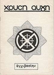 The Popular Association – Golden Dawn[12][13] (Greek: Λαϊκός Σύνδεσμος – Χρυσή Αυγή, Laïkós Sýndesmos – Chrysí Avgí), usually known simply as Golden Dawn (Greek: Χρυσή Αυγή, Chrysí Avgí pronounced [xriˈsi avˈʝi]), is a nationalist far-right[14] political party in Greece. It is led by Nikolaos Michaloliakos.