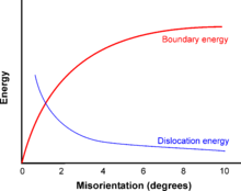 The energy of a low-angle boundary is dependent on the degree of misorientation between the neighbouring grains up to the transition to high-angle status. In the case of simple tilt boundaries the energy of a boundary made up of dislocations with Burgers vector b and spacing h is predicted by the Read-Shockley equation: