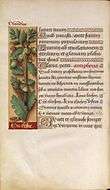 The book is also remarkable for its realistic representations of 337 plants in the borders that most text pages are given.[9] There are flowers, cultivated and wild, shrubs, some trees and among the plants a wide variety of insects and small animals of the countryside. The plants include Cannabis sativa on f. 90v, and the major cereal crops of the day on ff. 94–96. The insects represented are butterflies and moths, dragonflies, grasshoppers, caterpillars, beetles, flies, carpenter bees, crickets, earwigs, bees and beetles. The small animals represented are snakes, lizards, slow worms, frogs, turtles, squirrels, snails, rabbits, monkeys and spiders. The style borrows from the elaborate and realistic borders of natural life developed in the preceding decades by Flemish illuminators, but unlike them Bourdichon generally treats only one species on a page, and often shows roots and bulbs, and labels each page with the plant's name in Latin and French, in the manner of a florilegium or a herbal (a book on medicinal plants).[10] In most pages the border is a single panel to the outside of the text, but in others it surrounds the text on all four sides. The plants are shown as if laid out on a plain coloured surface, upon which they cast a shadow. In 1894 Giulio Camus wrote an account of the plants in the work, and a full modern facsimile was published in 2008. There are 395 images from the book available online through the BnF.[11]