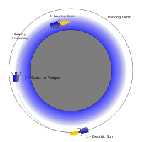 The vehicle begins by orienting for a retrograde burn to reduce its orbital velocity, lowering its point of periapsis to near the surface of the body to be landed on. If the craft is landing on a planet with an atmosphere such as Mars the deorbit burn will only lower periapsis into the upper layers of the atmosphere, rather than just above the surface as on an airless body. After the deorbit burn is complete the vehicle can either coast until it is nearer to its landing site or continue firing its engine while maintaining zero angle of attack. For a planet with an atmosphere the coast portion of the trip includes reentry through the atmosphere as well.