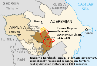 The conflict escalated into a full-scale war with the captured Shusha by Armenian forces on 9 May 1992. By 1993, the Armenian forces took control over not only the originally disputed Nagorno-Karabakh, but also several districts surrounding the region.[94] A ceasefire agreement was eventually signed on 5 May 1994 in Bishkek, Kyrgyzstan. According to Thomas de Waal, three factors contributed to the victory of the Armenian side: "Azerbaijan's political and military chaos, greater Russian support for the Armenians, and the Armenians' superior fighting skills."[95] Since the 1994 ceasefire, the Armenian Nagorno-Karabakh Republic has de facto control of the territories taken over in the war.[96]