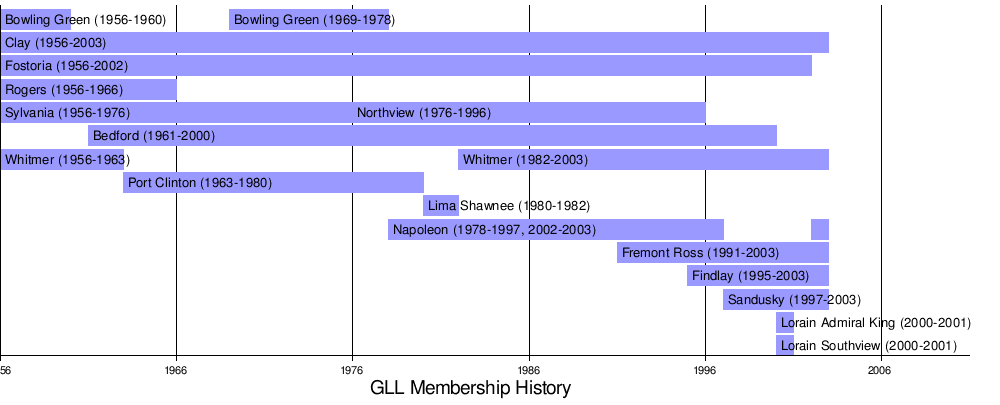 For the GLL's final year of existence in the 2002-03 school year, the members were Clay, Findlay, Fremont Ross, Napoleon, Sandusky, and Whitmer. Clay and Whitmer had accepted an invitation to join the Toledo City League for the following school year, and the league would not continue with four members. The Greater Buckeye Conference was created for the 2003-04 school year, which brought Findlay, Fremont Ross, and Sandusky back with former Buckeye Conference member Marion Harding, while Napoleon remained and Lima Senior joined.