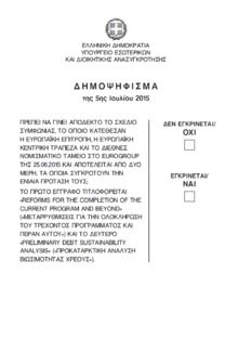 A referendum to decide whether Greece was to accept the bailout conditions in the country's government-debt crisis proposed jointly by the European Commission (EC), the International Monetary Fund (IMF) and the European Central Bank (ECB) on 25 June 2015, took place on 5 July 2015.[1] The referendum was announced by Prime Minister Alexis Tsipras in the early morning of 27 June 2015, and ratified the following day by the Parliament and the President. It was the first referendum to be held since the republic referendum of 1974, and the only one in modern Greek history not to concern the form of government.