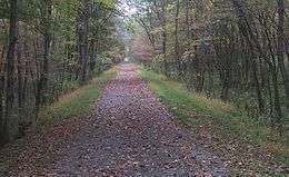The Greenbrier River Trail is a rail trail operated by West Virginia State Parks.[1] The trail is a 77-mile (124 km) long former railroad, now used for hiking, bicycling, ski-touring, horseback-riding, and wheel-chair use. The trail passes through numerous small towns and traverses 35 bridges and 2 tunnels as it winds its way along the valley. Most of the trail is adjacent to the free-flowing[2] Greenbrier River and is surrounded by peaks of the Allegheny Mountains.