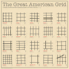 In maps of larger American cities the downtown areas are almost always grids. These areas represent the original land dimensions of the founded city, generally around one square mile. Some cities expanded the grid further out from the centre, but maps also show that, in general, as the distance from the centre increases, a variety of patterns emerge in no particular discernible order. In juxtaposition to the grid they appear random. These new patterns have been systematically classified and their design characteristics measured[19]