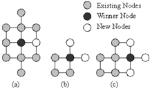 Node growth options in GSOM: (a) one new node, (b) two new nodes and (c) three new nodes.